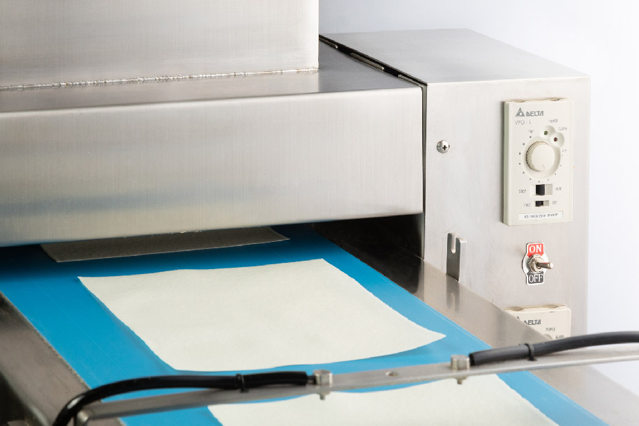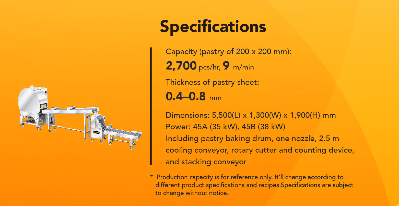 ![]() | The automated wrapper producing system coats the baking drum with batter also the thickness of the wrapper is adjustable. |